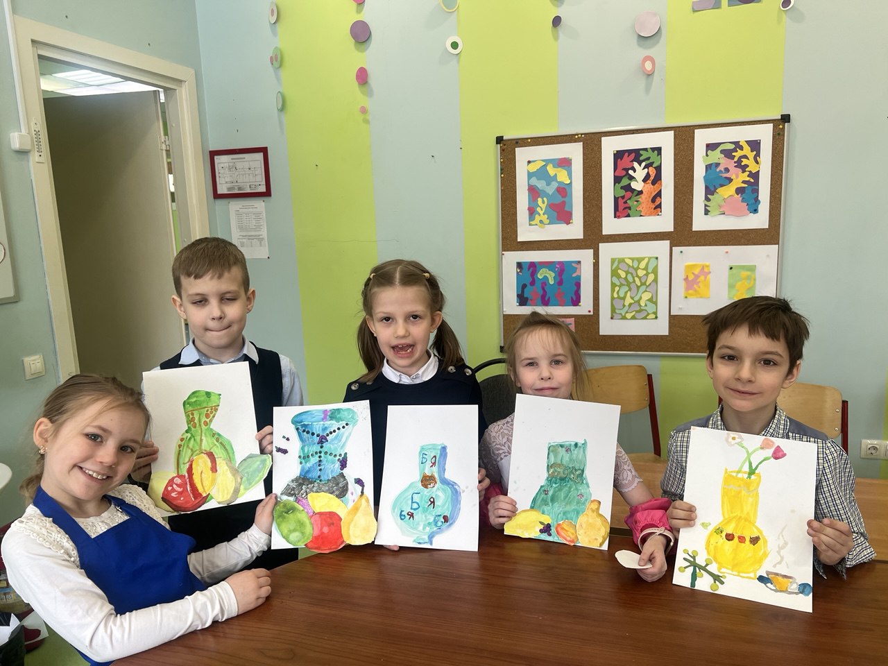 Юные художники с особым старанием подготовили замечательные натюрморты. На их полотнах ожили кувшины, украшенные росписью, а иногда и буквами, которые придавали работам индивидуальность и неповторимый шарм. На переднем плане расположились аппетитные фрукты — сочные лимоны и спелые груши, создавая атмосферу уюта и солнечного настроения. Результат превзошел все ожидания! Натюрморты получились невероятно выразительными, яркими и полными жизни.