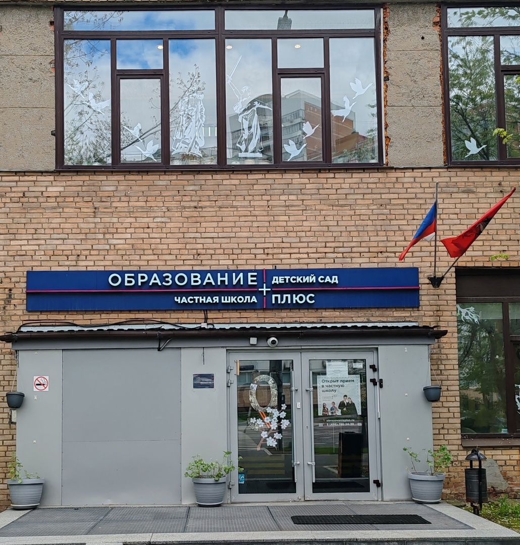 Уже сегодня, переступая порог школы ОБРАЗОВАНИЕ ПЛЮС…I, ощущаешь приближение важной даты. Фасад здания украшен развевающимися флагами России и Знаменем Победы, символизирующими единство народа и память о героическом прошлом. Окна школы, словно холсты, расписаны яркими и трогательными патриотическими рисунками. На них изображены: Родина-мать, памятник Воин-освободитель, улетающий клин журавлей, символизирующий души павших солдат. Все это детское понимание войны, уважение к ветеранам и гордость за свою страну.